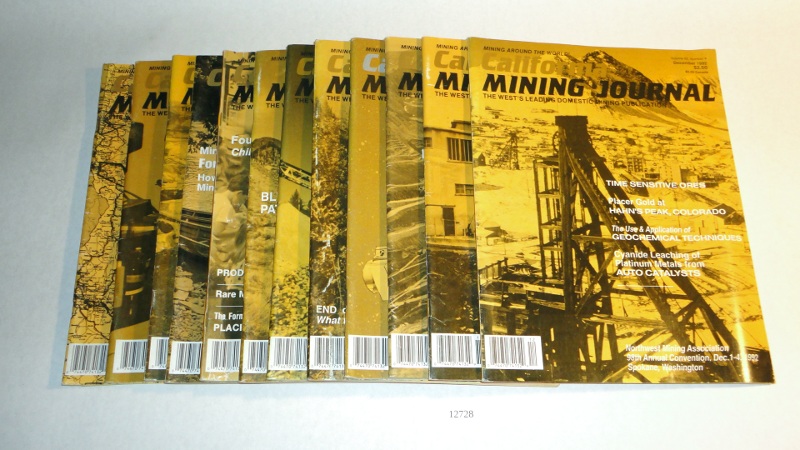 | 13728 | Harn, Kenneth L., editor | California Mining Journal 1992 complete, 12 issues | Kenneth L. Harn | Good. Very occasional ink notes and creasing. | 8.25 x 10.75 international mining magazines with interesting articles, b&w photos and ads. Mining in Mexico, Arizona, California, Alaska, Oregon, Washington State, Nevada, Idaho and all over the world. | Mining, gold | $20 |