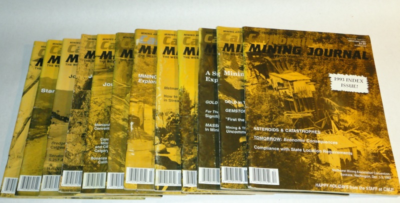 | 13729 | Harn, Kenneth L., editor | California Mining Journal 1993 complete, 12 issues | Kenneth L. Harn | Good. Very occasional ink notes and creasing. | 8.25 x 10.75 international mining magazines with interesting articles, b&w photos and ads. Mining in Mexico, Arizona, California, Alaska, Oregon, Washington State, Nevada, Idaho and all over the world. | Mining, gold | $20 |