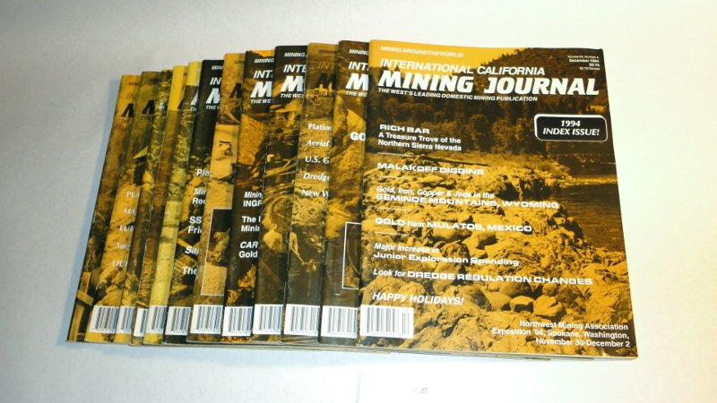| 13730 | Harn, Kenneth L., editor | International California Mining Journal 1994 complete, 12 issues | Kenneth L. Harn | Good. Very occasional ink notes and creasing. | 8.25 x 10.75 international mining magazines with interesting articles, b&w photos and ads. Mining in Mexico, Arizona, California, Alaska, Oregon, Washington State, Nevada, Idaho and all over the world. | Mining, gold | $20 |