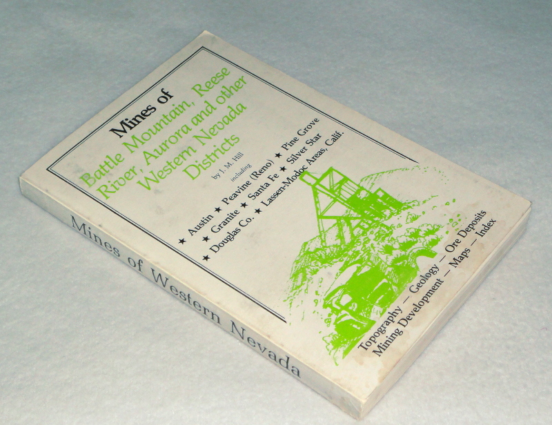 | 13775 | Hill, J. M. | Mines of Battle Mountain, Reese River, Aurora and other Western Nevada Districts | Nevada Publications | Good. Some discoloring on the bottom of the front cover. | Mines of Nevada, there are b&w photos and an index. Includes a 26.5 by 15 inch map of the Reese River Mining District. | Nevada, Mining | $20 |