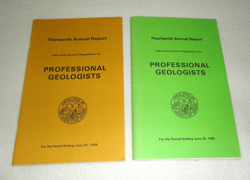 | 13826 | Anon | Thirteenth and Fourteenth Annual Reports Idaho State Board of Registration for Professional Geologists | Idaho State Board of Registration | Good. | 5 3/8 by 8.5 inches, two booklets on Idaho professional Geologists with laws, regulations and member names. | Idaho, Mining, Geology | $20 |