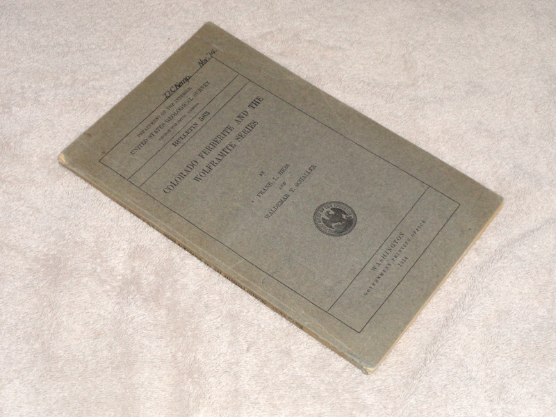 | 15242 | Hess, Frank L. and Waldemar T. Schaller | Colorado Ferberite And The Wolframite Series | Government Printing Office | Good. Name on the cover. Wear on the top and bottom of the spine. Some light soiling, creasing and shelf wear. | Jnited States Geological Survey Bulletin 583 with many b&w photos, tables and a bibliography. | Colorado, Mining, Ferberite, Wolframite | $20 |