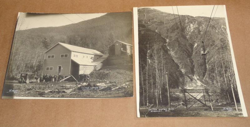 | 16013 | Bridgman, ? Photographer | United Empire Mine, Stewart, B.C., 1934, 2 8 x 10 inch photos | Bridgman | Good. | Two 8 x 10 photos by 'Bridgman' of the United Empire Mine in Stewart, B.C.. One of buildings, a car and peoople, the other of someone riding in an overhead gondola? | British Columbia, Stewart, B.C., Canada, Mining, ephemera, photography | $25 |