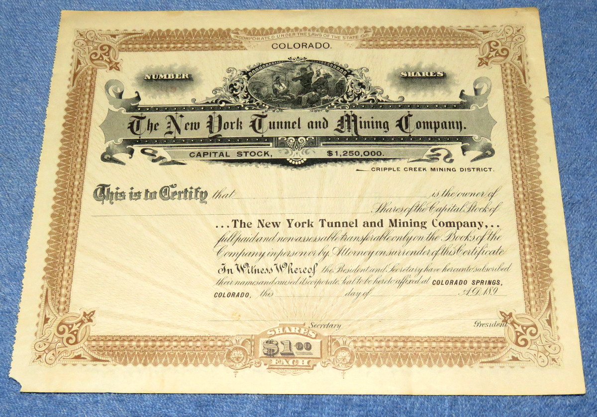 | 17552 | Staff | The New York Tunnel and Mining Company, blank stock certificate | The New York Tunnel and Mining Company | Good. One corner chipped, back has 3 stains. | The New York tunnel and Mining Company, Cripple Creek Mining District, Colorado. | Mining, The New York Tunnel and Mining Company | $25 |