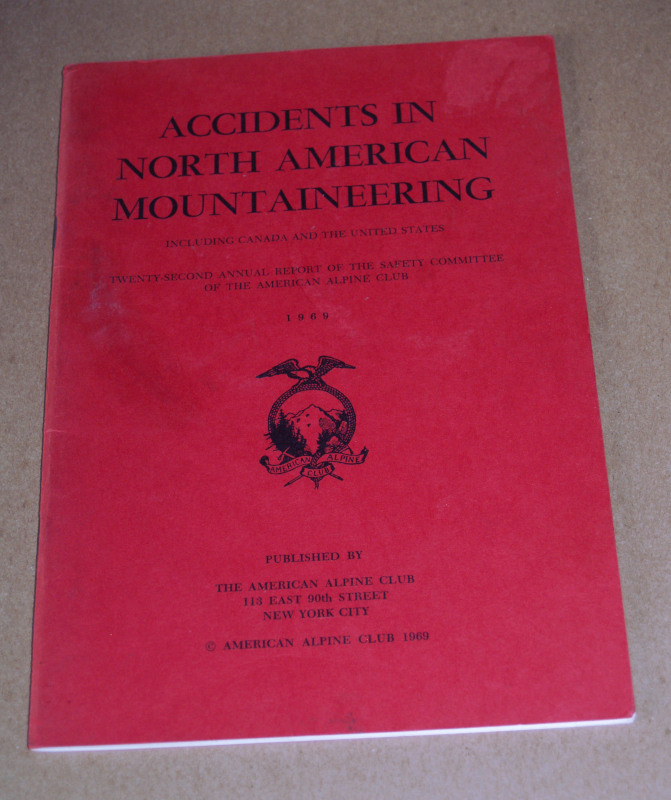 | 17016 | Staff | Accidents In North American Mountaineering Including Canada and the United States | The American Alpine Club | Good. Light shelf wear and soiling on the covers.. | Mountaineering accidents. | Mountaineering | $20 |