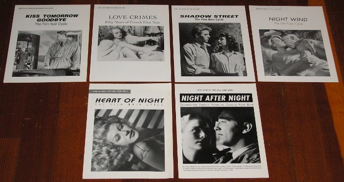 | 12637 | Seattle Art Museum | The Film Noir Cycle, 6 programs, a partial run | Seattle Art Museum | Very good. | 8.5 x 11 inches. The Film Noir Cycle. Kiss Tomorrow Goodbye, 1992, Love Crimes Fifty Years of French Film Noir, 1994, Shadow Street, 1995, Night Wind, 1996, Night After Night Celebrating Twenty Years Of Classic Film Noir, 1997 and Heart Of Night, 1998 | Film Noir, Cinema, Movie, Seattle Art Museum, Pacific Norhwest, Washington State. | $30 |