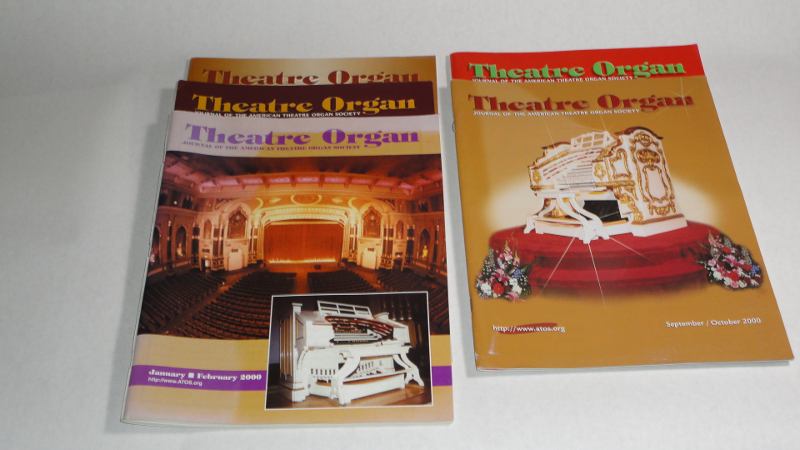 | 14024 | DeLay, Thomas L. | Theatre Organ Journal Of The American Theatre Organ Society 2000 5 issues | The American Theatre Organ Society | Very good. January-February issue has a sun fade on the front cover. | 8.5 x 11 inches with interesting articles and photos on theatre organs. Missing March-April. Each issue covers 2 months. | Theatre Organ, Theater Organ, Cinema | $20 |