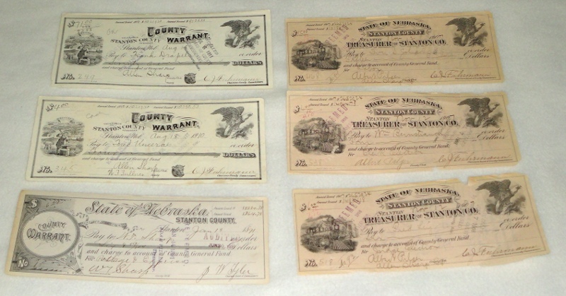 | 13595 | Treasurer of Stanton County, Nebraska | Treasurer of Stanton County, Nebraska, 6 redeemed county warrents from 1891 to 1911 | Treasurer of Stanton County, Nebraska | Good. Good. There is some chipping and soiling. | Redeemed county warrents from Stanton County, Nebraska. The 1891 warrent is to W.T. Sharp, signed by P.W. Tyler. Others are signed by C. J. Fuhrmann and written to Fred Ley, Wm. Bernstanch, Fred Uncera, Irv S. Johnson, and Frenk Drapela | Ephemera, Stanton County, nebraska | $20 |