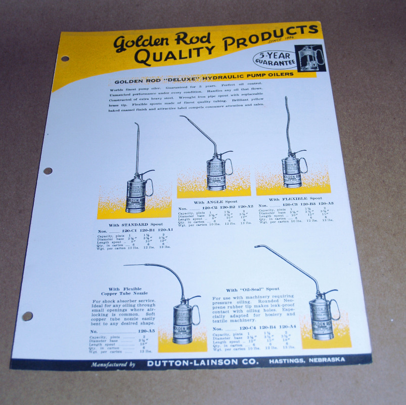 | 16973 | Dutton-Lainson Co. | Golden Rod Quality Products | Dutton-Lainson Co. | Good. | Trade Catalog, Dutton-Lainson Co., Hastings, Nebraska. Golden Rod hydraulic pump oilers, Golden Rod Tire Pump, and more. Illustrated pages, 8.5 x 11 inches. | Trade Catalog, Dutton-Lainson Co., Hastings, Nebraska | $20 |