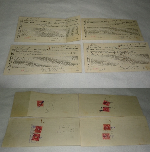 | 12439 | Agricultural National Bank of Pittsfield, Mass. | Collateral Notes for Ervine H. Combs 35 Dexter St., City | Agricultural National Bank of Pittsfield, Mass | Good. | Four collateral notes to the Bank of Pittsfield for Ervine H. Combs. Listed collateral are shares in American La France Fire engine Co. Pfd. and United Light & Rys?Co. Documentary stamps are on the back of each note. | Ephemera, Agricultural National Bank of Pittsfield, Ervine H. Combs, documentary stamps, philately | $20 |