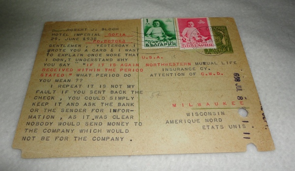 | 12446 | Bloch, Robert J. | Post Card to Northwestern Mutual Life Insurance Company in 1938 | Bloch | Fair to good. Processing marks, soiling. | Robert J. Bloch, writing a postcard from the Hotel Imperial, Sofia, Bulgaria, June 29, 1938, takes the Northwestern Mutual Life Insurance Company to task for missed communication and no follow through on a check sent and returned. | Robert J. Bloch, Northwestern Mutual Life Insurance Company, ephemera, philately | $20 |