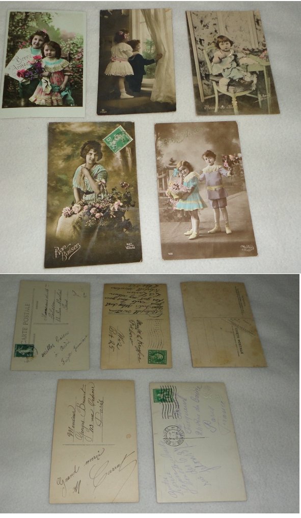 | 12448 | anon. | Five hand tinted French and German Post Cards from the early 1900s | Multiple | Good. Light shelf wear and soiling. Four of the cards have been used. | Five hand tinted post cards from France and Germany in the early 1900s. One is blank on the back. Three were mailed to Paris and another to Wisconsin. The three French mailings have stamps. The Wisconsin card also has a US one cent stamp. Myrka and Veloute are logos on two cards. | Post Card, hand tinted, philately, epherera | $20 |