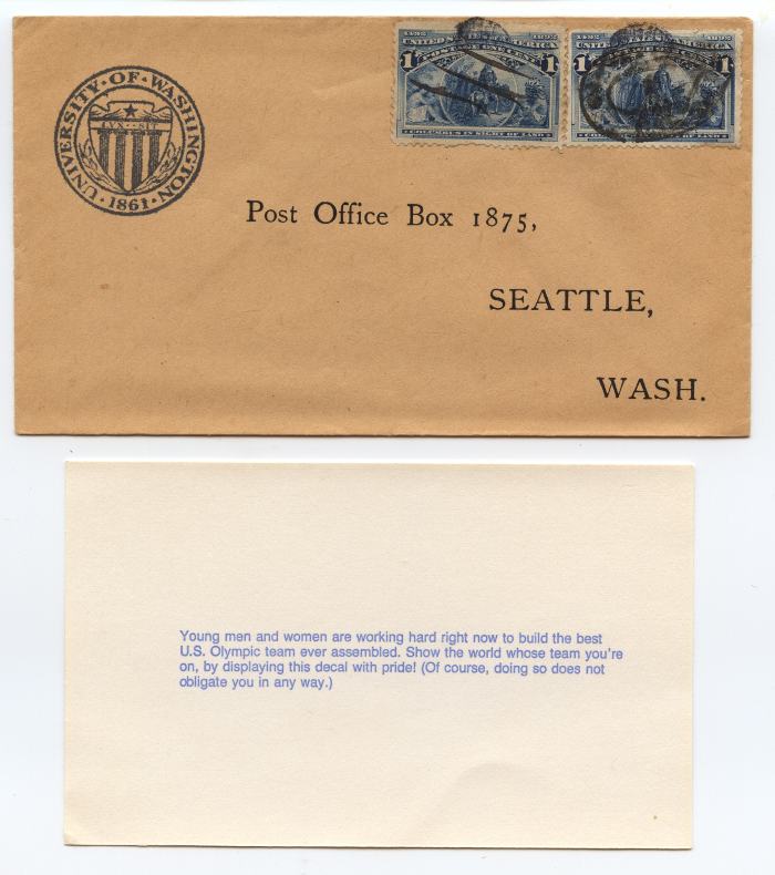 | 13189 | University of Washington | University of Washington Postal Cover Circa 1894 | University of Washington | Good. Yellowing. | A postal cover with two one cent stamps, Scott 230, with the UW Logo on the left and a card inside thanking the recipient for their purchase of a decal (not present) in support of the U.S. Olympic team from 1894. | Philately, postal cover, Scott 230, 1894 Olympics, Washington State, ephemera | $25 |