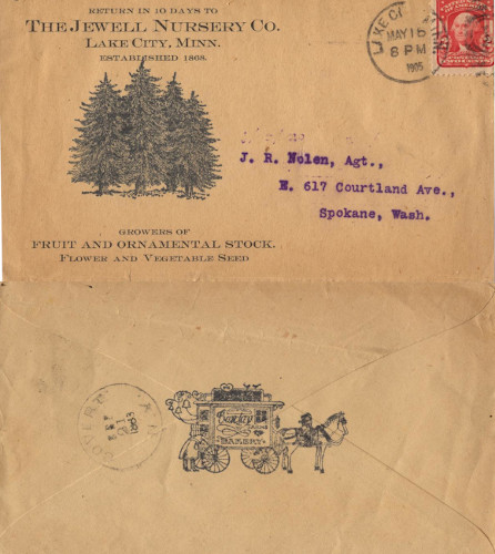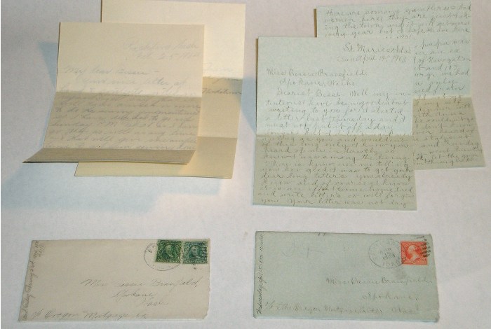 | 13195 | Mildred on one letter, Sylvia Nordstrom on the other | Miss Bessie Brasfield, Spokane, Wash | Mildred and Sylvia Nordstrom | Good. Some soiling and wear on the envelopes | Two letters to Bessie Brasfield. The first, from Mildred in St. Maries, Idaho, is 8 pages long and full of news. The second from 1904 is two and a half pages from Sylvia Nordstrom in Rockford, WA.. She's coming on the evening train to sew and visit. | Philately, ephemera, Spokane, Washington State, Sylvia Nordstrom, Bessie Brasfield | $20 |