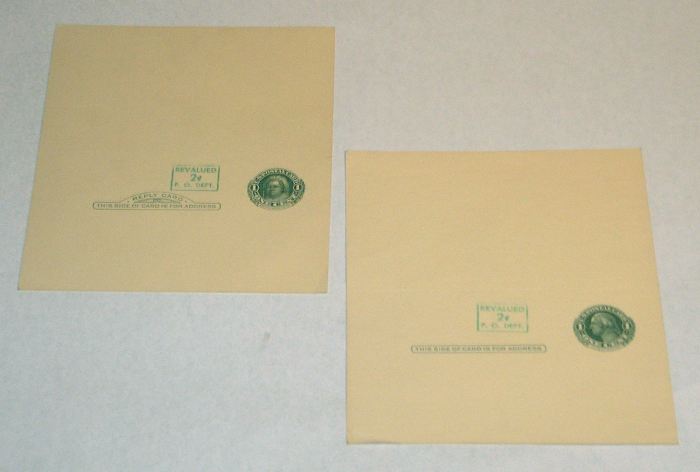 | 13197 | U.S. Postal Reply Card | U.S. Postal Reply Card UY14B (two) | U.S. Post Office | Good. Faint creasing and soiling. | Scott UY14B, unsevered, postal reply cards. | Scott UY14B, Philately, ephemera | $20 |