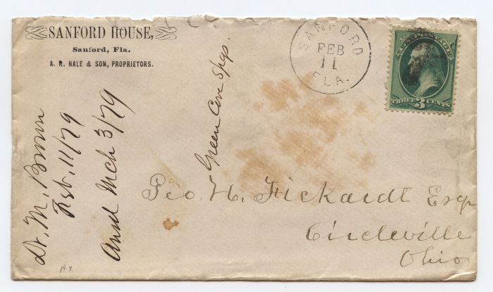 | 13199 | Sanford House, Sanford, Florida | George H. Fickardt Postal Cover 1879 | Sanford House | Good. Shelf worn and soiled. | A postal cover from the Sanford House in Sanford, FL to George H. Tickardt in Circleville, OH. Dr. M. Brown is referenced on the front as is Green Cove Springs. Scott 184 stamp. | Philately, ephemera, Sanford House, Sanford Florida, George H. Fickardt, Circleville, Ohio | $20 |