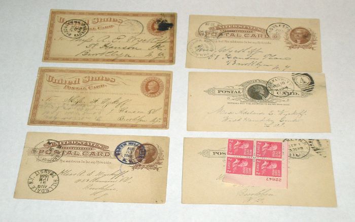 | 13200 | Various | Miss. Adelaide E. Wyckoff, six postal cards | Various | Good. Some wear and soiling. A corner block of 2 cent stamps is stuck on the front of one card. | Miss Wyckoff is at 58 Hanson Place, Brooklyn, New York. The cards are postmarked from Brooklyn and Hillsdale in NY and Philadelphia, PA., from her mother and others. | Ephemera, Philately, Adelaide E. Wyckoff | $20 |