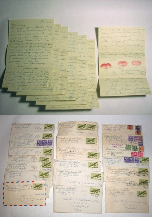 | 13476 | Kratochwil, Irene | Twenty one love letters to Chester E. Wilmore, SF2, USN | Self | Good. Slight shelf and storage wear. | Twenty one letters from Irene Kratochwil in Central Falls, Rhode Island to Chester E. Wilmore in Oregon. She accepts a marriage proposal and asks for money to come out to Oregon. In letter 20 she sends the money back and says she has to stay true to her Catholic religion and can't marry a Protestant. In letter 21 she is lonely. Young love. Red lipstick kisses on the letters. | Philately, Irene Kratochwil, Chester Wilmore, ephemera | $40 |