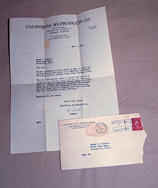 | 16350 | Neal, E., California By-Products Co. | California By-Products Co. letter from 1930 | California By-Products Co. | Good. Stain on the letter, the envelope is torn. | California By-Products Co., Manufacturers Importers and Exporters of Sausage Casings replys to a customer ordering "Handbook On Archery." (Cable Address "CALGUT") | Ephemera, California, California By-Products Co., philately | $25 |