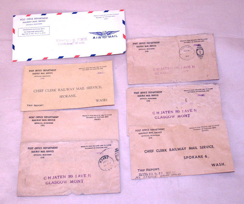 | 16665 | Post Office Department Railway Mail Service | Railway Mail service, 7 envelopes from the 1940s | Railway Mail Service | Good. Some envelopes have wear and soiling. | 6 regular size envelopes. 1 is blank, 2 are pre-addressed to Chief Clerk Rail way Mail , Spokane, 3 pre-addressed to Glasgow, Montana, one business size airmail envelope addressed to the chief clerk in Spokane. | Railway Mail Service, Railroad, Railroadiana, Spokane, Washington, Glasgow, Montana, philately, ephemera | $30 |