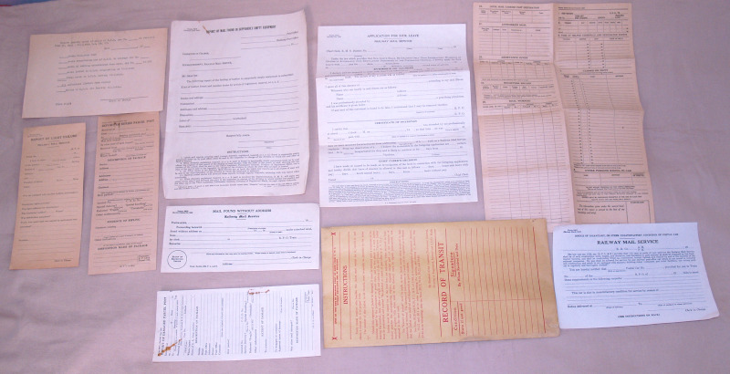 | 16667 | Railway Mail Service | 10 different Railway Mail Service Forms from the 1930s and1940s | Railway Mail Service | Good. Some soiling, creasing and wear. | Report of Mail Found in Supposedly Empty Equipment, Record of Transit envelope, notice of insanitary...postal car, report of rifled parcel post, mail found without address, application for sick leave, ....count of mails in R.P.O. Car..., trip report, report of damaged parcel post, and report of light failure. | Railway Mail Service, Railroad, Railroadiana, philately, ephemera. | $25 |