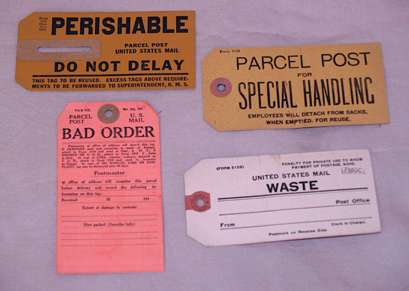 | 16672 | Railway Mail Service | 4 Railway Mail Service bag tags from the 1930s and 1940s | Railway Mail Service | Very good. | 4.75 x 2.5 inches, form 5135 Parcel Post for Special Handling, form 5138 Perishable Do Not Delay, form 5152 Bad Order and Form 5156 United States Waste. | Railway Mail Service, railroad, railroadiana, philately, ephemera | $25 |