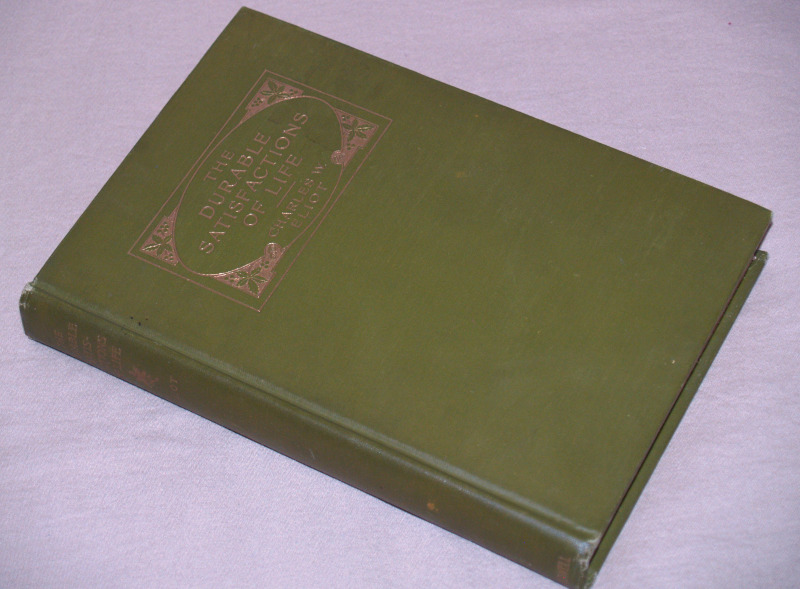 | 16692 | Eliot, Charles W. | The Durable Satisfactions of Life | Thomas Y. Crowell & Co. | Good. Light shelf wear and soiling on the covers and spine. No dust wrapper. | Philosophy | Philosophy | $20 |