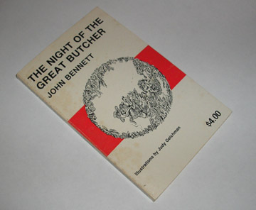 | 10383 | Bennett, John | The Night of the Great Butcher | December Press | Good. Covers have light shelf wear and soiling. | 1976 paperback, inscribed by the author, with 118 pages and illustrations by Judy Geichman. ISBN 0-913204-05-6 | poetry | $25 |