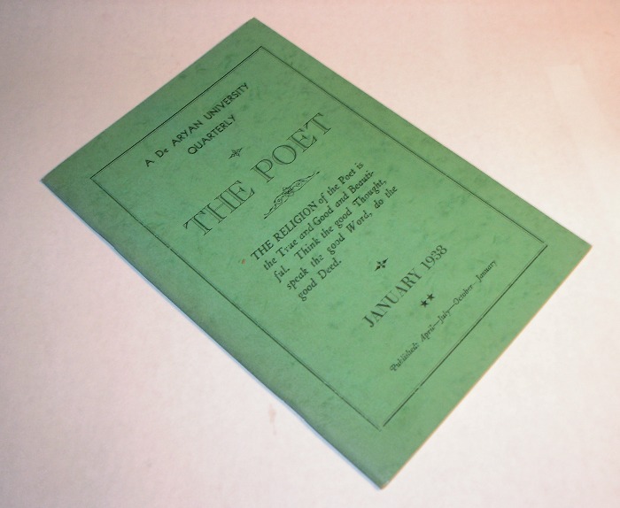 | 12469 | De Aryan, Leon, editor | A De Aryan University Quarterly The Poet, Vol. 2, No. 1 | De Aryan University | Good. Light shelf wear and soiling. The pages are browning. | 6x9 inches. Poetry from many authors-there are multiple articles on "Are Poets Crazy Or Just Queer?" The De Aryan University has an ad at the back solicitiing students for the university's course on how to be a columnist. A Leon De Aryan, with his son, published "The Broom," an anti-semitic paper in California. Perhaps the same person. | Leon De Aryan, Poetry | $30 |