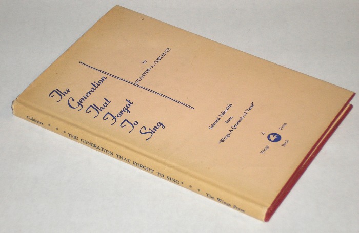 | 12879 | Coblentz, Stanton A. | The Generation That Forgot To Sing Selected Editorials from "Wings, A Quarterly of Verse" | The Wings Press | Good. Both the front and back paste downs have some light brown spots. There's a bookplate in front. In a very good dust wrapper. | Selected Editorials from "Wings, A Quarterly of Verse." Prose and poetry. | Poetry, Wings Quarterly, Poetry | $20 |
