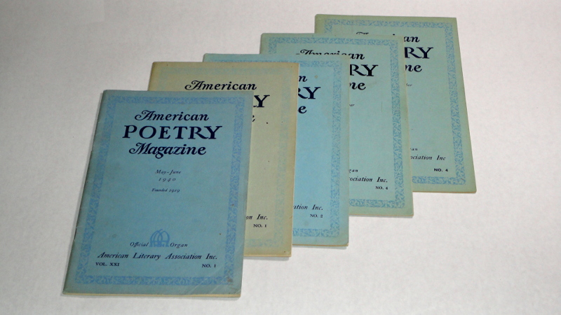 | 14302 | Prince, Clara Catherine | American Poetry Magazine, 5 issues, 1940-1943 | American Literary Association Inc. | Very good. Light shelf wear. | 6 x 9 inches, poetry. Vol. XXI NO. 1, Vol. XXII NO.1, Vol. XXIII NO.2, Vol. XXIII NO. 4, and Vol. XXIV NO. 4 | Poetry | $20 |