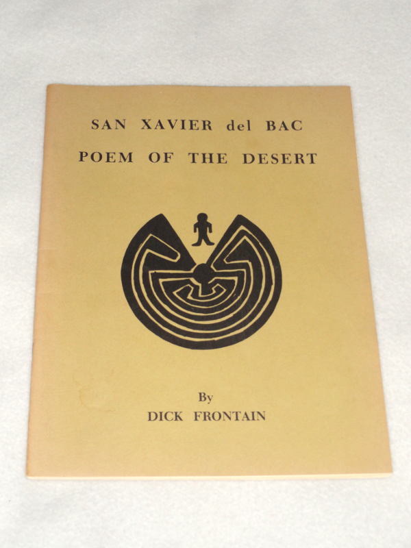 | 14625 | Frontain, Dick | San Xavier del BAC Poem Of The Desert | Self-published | Very good. | 8.5 x 11 inches, poetry about San Xavier del BAC, historic Catholic mission South of Tucson, AZ. There are b&w photos. | Poetry, Arizona, Catholic, San Xzvier del BAC | $20 |