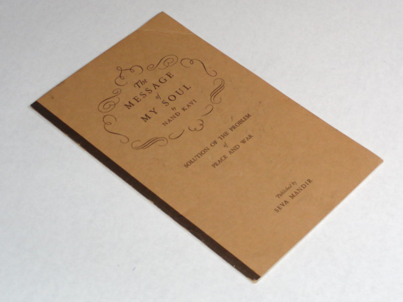 | 14963 | Kavi, Nand | The Message of My Soul Solution Of the Problem of Peace And War | Seva Mandir | Good. Minor creases and some soiling. | Poetry. The author's signature is on the back cover. Bhuddism, Yoga | Bhuddism, Poetry | $25 |