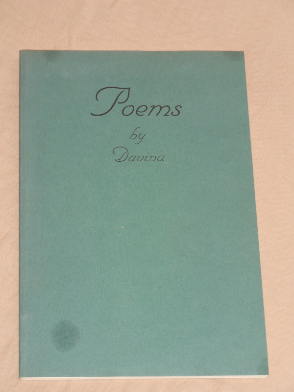 | 15741 | Kosh, Davina | Poems by Davina Kosh | Self-published | Good. Three soiling marks on the front cover. | 6 x 9 inch book of poetry. There's a 5 line inscription by the author. | Poetry | $20 |