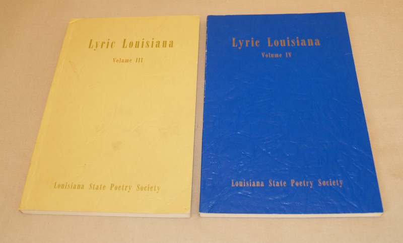 | 16129 | Wall, Mary B., chairman | Lyric Louisiana Volume III & Volume IV | The Louisiana State Poetry Society | Good. Light soiling. | Volume IV is inscribed by one of the poets. | Poetry, Louisiana | $20 |