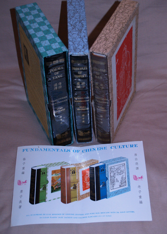 | 16864 | Zi-Chang, Tang | Fundamentals Of Chinese Culture, 3 Volumes: Poems of Tang, Principles of Conflict and Wisdon of Dao | T. C. Press | Good. Lightly worn slip cases. Plastic dust wrappers, wrappers have some wrinkles. | Tang poetry, wisdom of Dao Taoism, Sun Zi art of war. Includes the original 10 x 7 inch prospectus. | Tang Poetry, Taoism, Sun Zi | $800 |