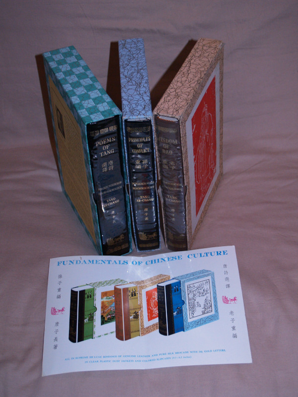 | 16865 | Zi-Chang, Tang | Fundamentals Of Chinese Culture, 3 Volumes: Poems of Tang, Principles of Conflict and Wisdon of Dao | T. C. Press | Good. Lightly worn slip cases. Plastic dust wrappers, wrappers have some wrinkles. | Tang poetry, wisdom of Dao Taoism, Sun Zi art of war. Includes the original 10 x 7 inch prospectus. | Tang Poetry, Taoism, Sun Zi | $800 |