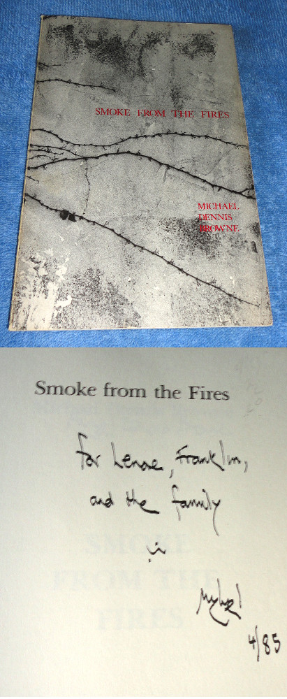 | 17235 | Browne, Michael Dennis | Smoke From The Fires | Carnegie-Mellon University Press | Good. Ink mark on one? page. | Poetry. Inscribed and signed by the author. | Poetry | $20 |