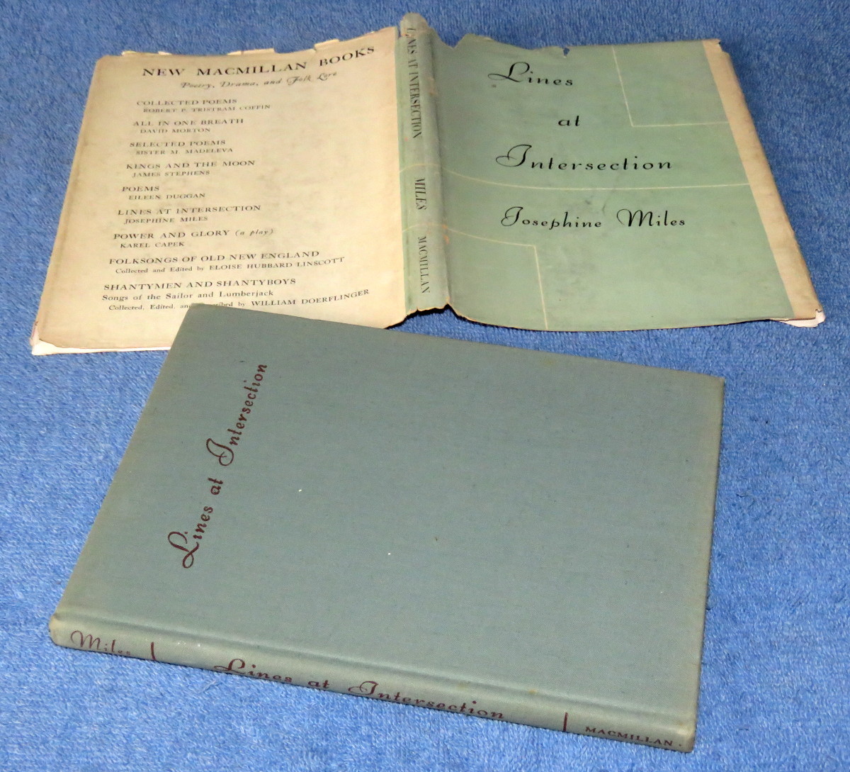 | 17533 | Miles, Josephine | Lines at Intersection | The Macmillan company | Good. Slight soiling. In a poor dust wrapper. | Poetry | Poetry | $25 |