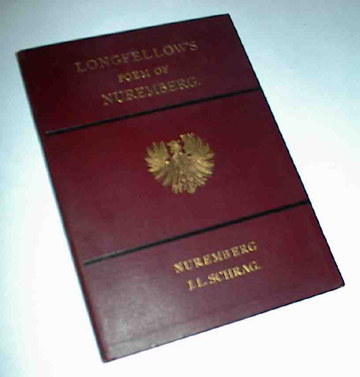 | 9900 | Longfellow, Henry W. | Nuremberg. A Poem of Henry W. Longfellow | Joh. Leonh. Schrag | Very good with light shelf wear on the top and bottom of the spine. Covers faintly soiled. Owner's name and the date in ink inside. | 4.5 x 6.5 inches wine colored stiff cardpaper covers with gold lettering and design on the front. Circa 1890's, 2nd edition with illustrations and ads. | Poetry | $40 |
