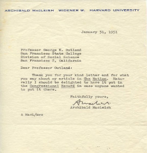 | 12493 | MacLeish, Archibald | Archibald MacLeish letter to George E. Outland with a Archibald MadLeish Widener W. Harvard University letterhead. | self | Good. Faint crease marks. | 5.5 x 8.5 inches, a note of thanks to Outland for a complimentary letter about an article in "The Nation." | Autograph, Archibald MacLeish, poetry, literature, Pullitzer prize | $125 |