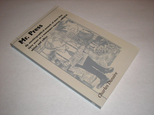 | 10971 | Dunsire, Charles | Mr. Press An Autobiographical Memoir of More Than Forty Years As a Newspaper Reporter, Editorial Writer and Editor. | Writer's Showcase | Very good with light shelf wear. | 2000 paperback, inscribed by the author, with 213 pages. An editor of the Seattle Post-Intelligencer for 40 years. ISBN 0595009719 | Pacific Northwest, Washington state, print media, Seattle Post-Intelligencer, Newspaper, Charles Dunsire | $20 |