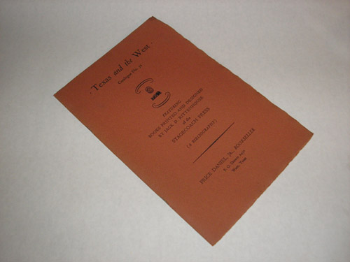 | 11762 | Daniel, Price, Jr. | Texas and the West Catalogue No. 32 Featuring Books Printed and Designed By Jack D. Rittenhouse of the Stagecoach Press | Price Daniel Jr. | Good. Minor wear and soiling on the covers. One faint stain on the top of the back cover. | 6 x 9 inches . There are photos of Jack D. Rittenhouse | Print media, Book catalogue, Price Daniel Jr., Americana, Jack D. Rittenhouse, Stagecoach Press, bibliography | $20 |