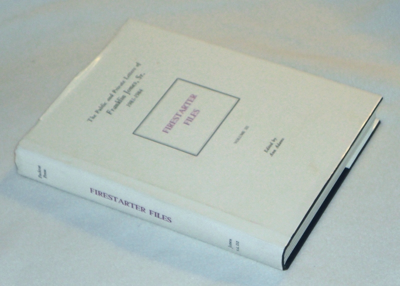 | 13754 | Jones, Franklin, Sr., edited by Ann Adams | Firestarter Files The Public and Private Letters of Granklin Jones, Sr. 1981 - 1984 Volume III | Packrat Press | Fine. In a good dust wrapper with light shelf wear and soiling | Politics and government. There's an index. | Politics, government, print media | $40 |