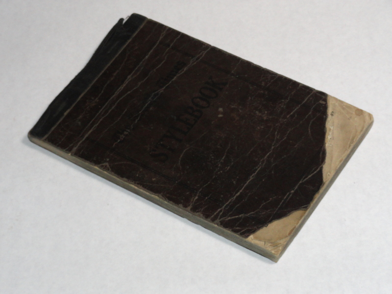 | 14753 | The Seattle Times | The Seattle Times Stylebook | The Seattle Times | Poor to fair. Spine binding torn, covers creased and chipped. Title page heavily soiled. Names and ink. 1st 3 pages missing corners. | 5 x 7.25 inches, stapled binding, a 'how to' for writers at The Seattle Times in 1950 | The Seattle Times, language, print media | $20 |