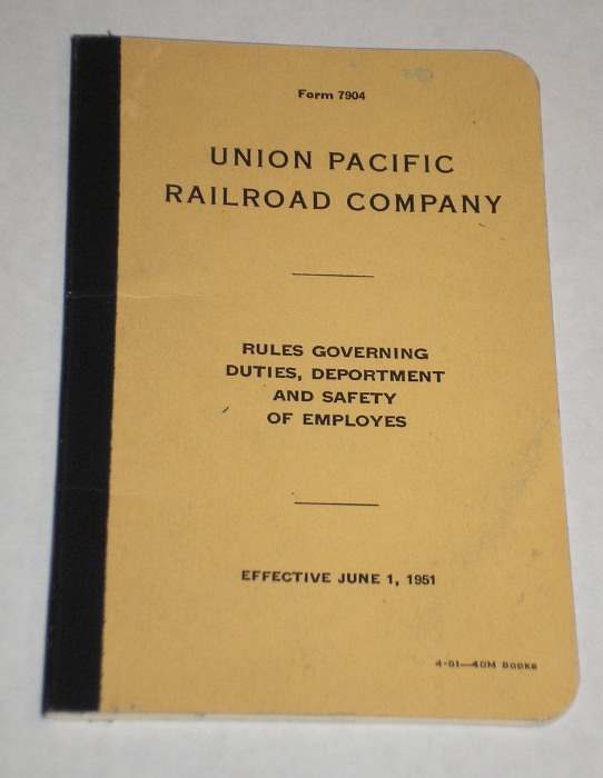 | 12739 | Union Pacific Railroad Company | Rules Governing Duties, Deportment and Safety Of Employees | Union Pacific Railroad Company | Good. Light soiling on the covers. | 4 x 6.5 inches, Union Pacific Form 7904 with rules for everything from artificial respiration to tobacco. | Union Pacific Railroad, Railroad, ephemera | $20 |