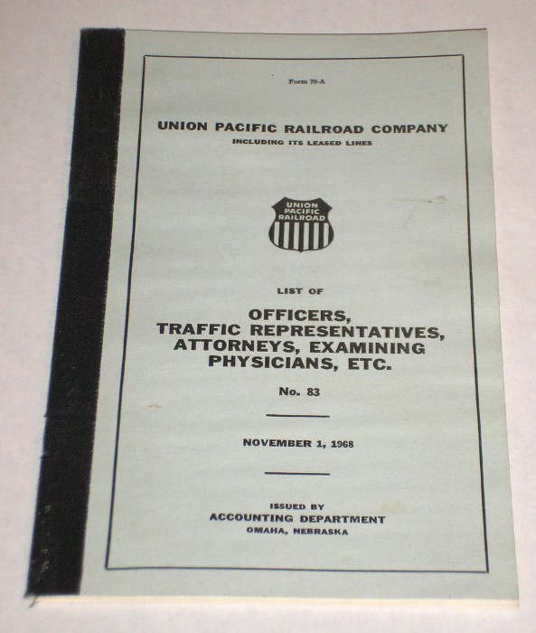 | 12741 | Union Pacific Railroad Company | List Of Officers, Traffic Representatives, Attorneys, Examining Physicians, Etc. No. 83 | Union Pacific Railroad Company | Good. Light soiling on the covers. There are ink check marks by several names. | 5 x 8 inches, form 70-A, a list of Union Pacific personnel and their location in 1968 | Union Pacific Railroad, Railroad, ephemera | $20 |