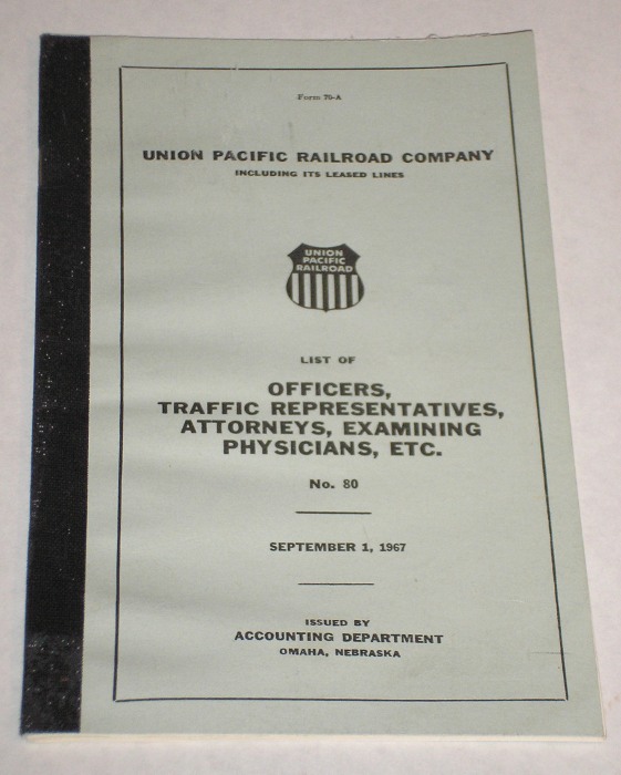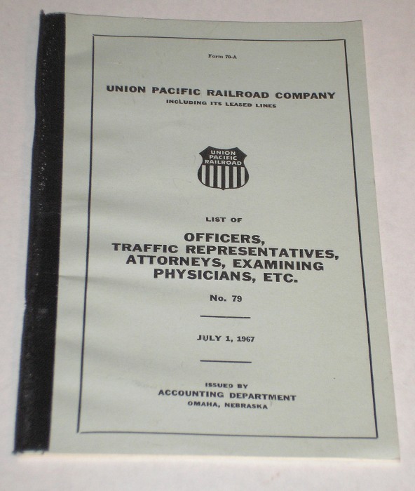 | 12742 | Union Pacific Railroad Company | List Of Officers, Traffic Representatives, Attorneys, Examining Physicians, Etc. No. 79 | Union Pacific Railroad Company | Good. Light soiling on the covers. There are ink check marks by several names. | 5 x 8 inches, form 70-A, a list and location of Union Pacific personnel and their locations in 1967 | Union Pacific Railroad, Railroad, ephemera | $20 |