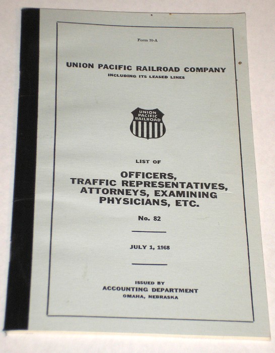 | 12744 | Union Pacific Railroad Company | List Of Officers, Traffic Representatives, Attorneys, Examining Physicians, Etc. No. 82 | Union Pacific Railroad Company | Good. Light soiling and faint creasing on the covers. | 5 x 8 inches, form 70-A, a list and location of Union Pacific personnel and their locations in 1968 | Union Pacific Railroad, Railroad, ephemera | $20 |