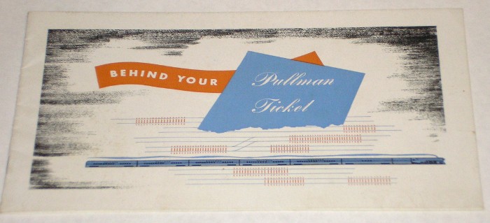 | 13148 | Pullman | Behind Your Pullman Ticket | Pullman | Good. | 8 x 5 inch brochure explaining railroad Pullman car features with many illustrations. | Railroad, Pullman, ephemera | $20 |